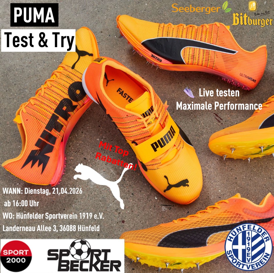 In Kooperation der Leichtathletik-Abteilung des Hünfelder SV mit "Sport Becker" und "Puma" kann man am kommenden Dienstag, ab 16 Uhr die neuen Puma NITRO Spike Modelle live auf der Rhönkampfbahn testen! Eine Gelegenheit, die man
