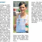 Am 18.09. ging es bei Temperaturen von 37 Grad im Schatten für Greta los; 80m Hürden standen auf dem Programm. Greta gleich im ersten Rennen des Vorlaufs. Die Nerven schon etwas angespannt; „nur keinen Fehlstart“ sind so die Gedanken von Greta. Der Start klappt reibungslos, über den Hürden sieht es richtig gut aus, im Ziel 12,39 Sekunden, den Lauf souverän gewonnen, nach den 5 Vorläufen des Tages die zweitbeste Vorlaufzeit, die eigene alte persönliche Bestzeit um rund eine halbe Sekunde verbessert, in der „Ewigen Bestenliste des Hünfelder SV“ die Zeit von Marina Zachartschuk um 0,1 Sekunde unterboten und Platz 12 der aktuellen Deutschen Bestenliste der Altersklasse W14. Das Greta richtig gut ist, das wissen wir; aber was war das für ein Lauf!! Die Worte danach: „Ich habe wieder niemanden gehabt der mich gezogen hat!“.