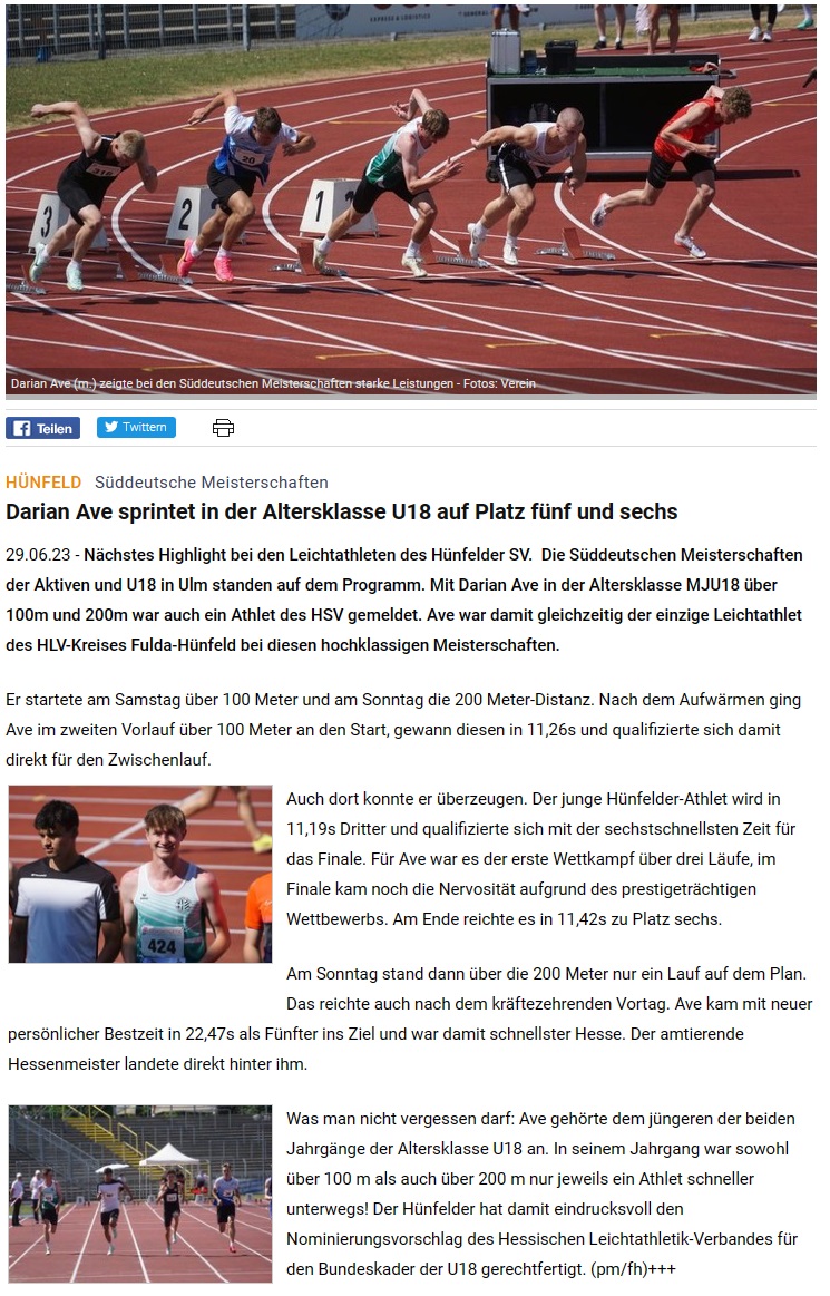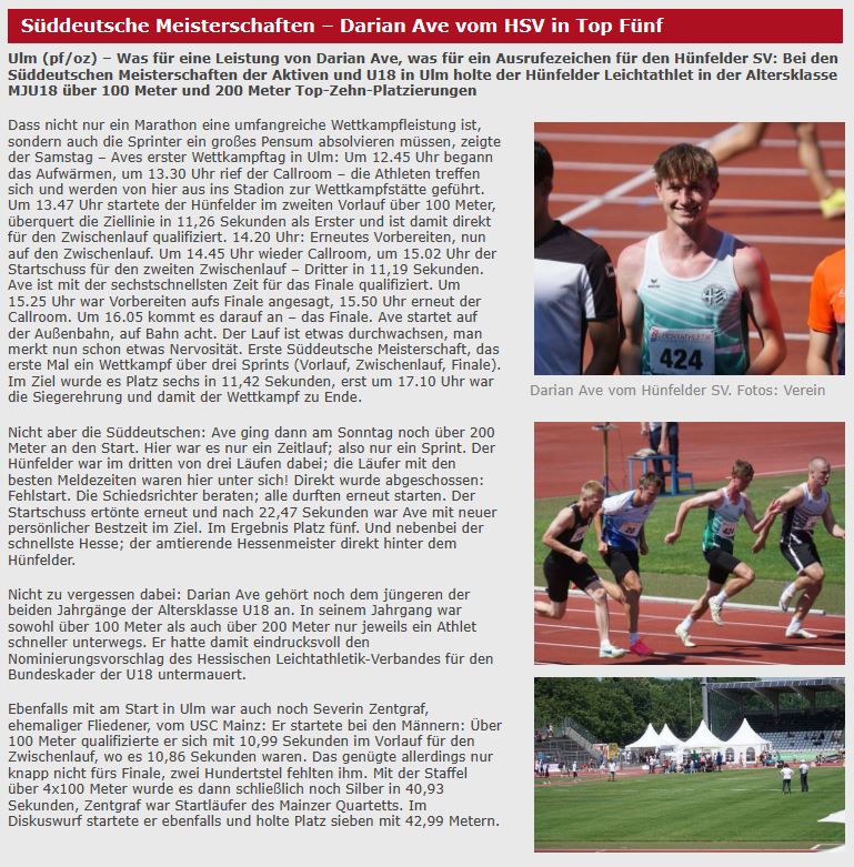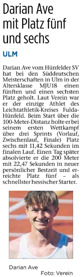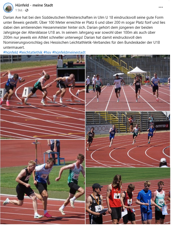 Nächstes Highlight bei den Leichtathleten des Hünfelder SV; die Süddeutschen Meisterschaften der Aktiven und U18 in Ulm. Vom Hünfelder SV ist Darian Ave in der Altersklasse MJU18 über 100m und 200m gemeldet. Und er ist auch gleichzeitig der einzige Leichtathlet des HLV-Kreises Fulda-Hünfeld bei diesen hochklassigen Meisterschaften. Darian startet am Samstag über die 100m- und am Sonntag über die 200m-Distanz.