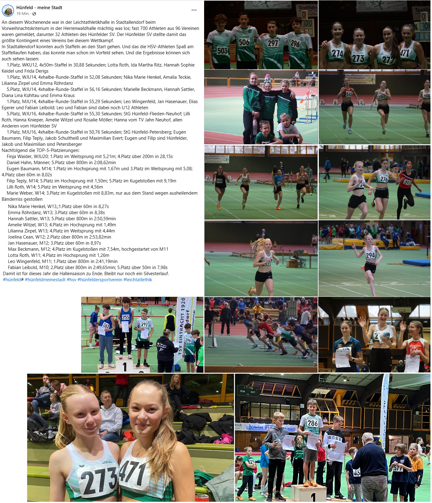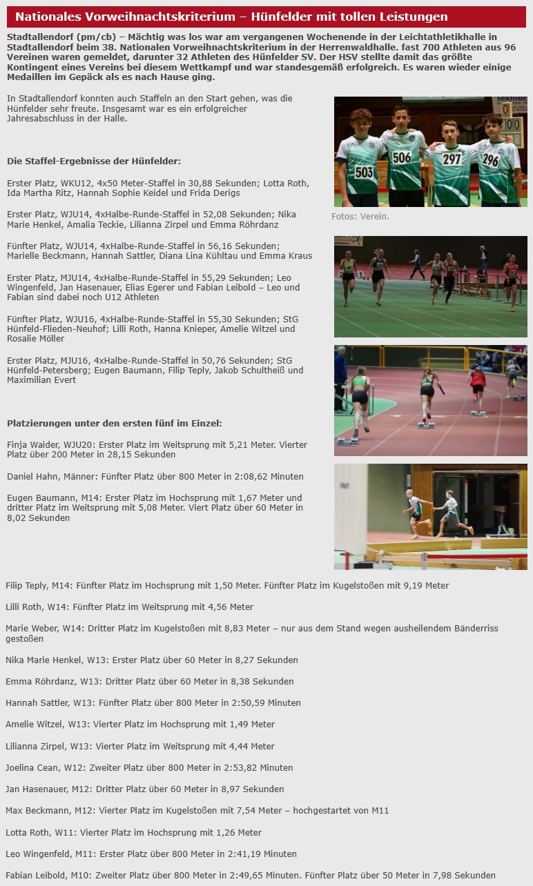 An diesem Wochenende war in der Leichtathletikhalle in Stadtallendorf mächtig was los; fast 700 Athleten aus 96 Vereinen waren gemeldet, darunter 32 Athleten des Hünfelder SV. Der Hünfelder SV stellte damit das größte Kontingent eines Vereins bei diesem Wettkampf.