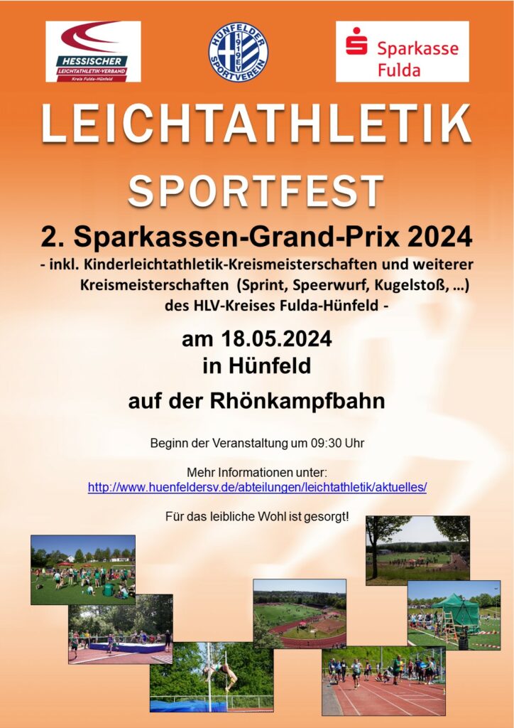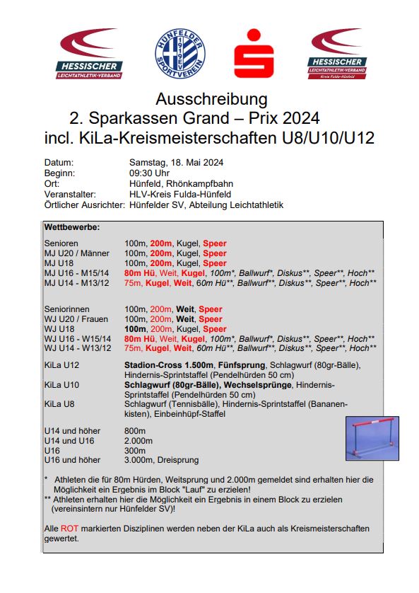 Vorschau: 2. Sparkassen-Grand-Prix 2024 incl. KiLa-Kreismeisterschaften, … am 18.05.2024 in Hünfeld auf der Rhönkampfbahn