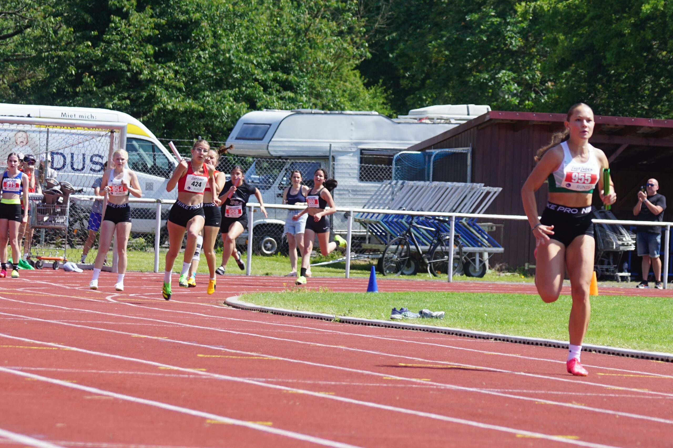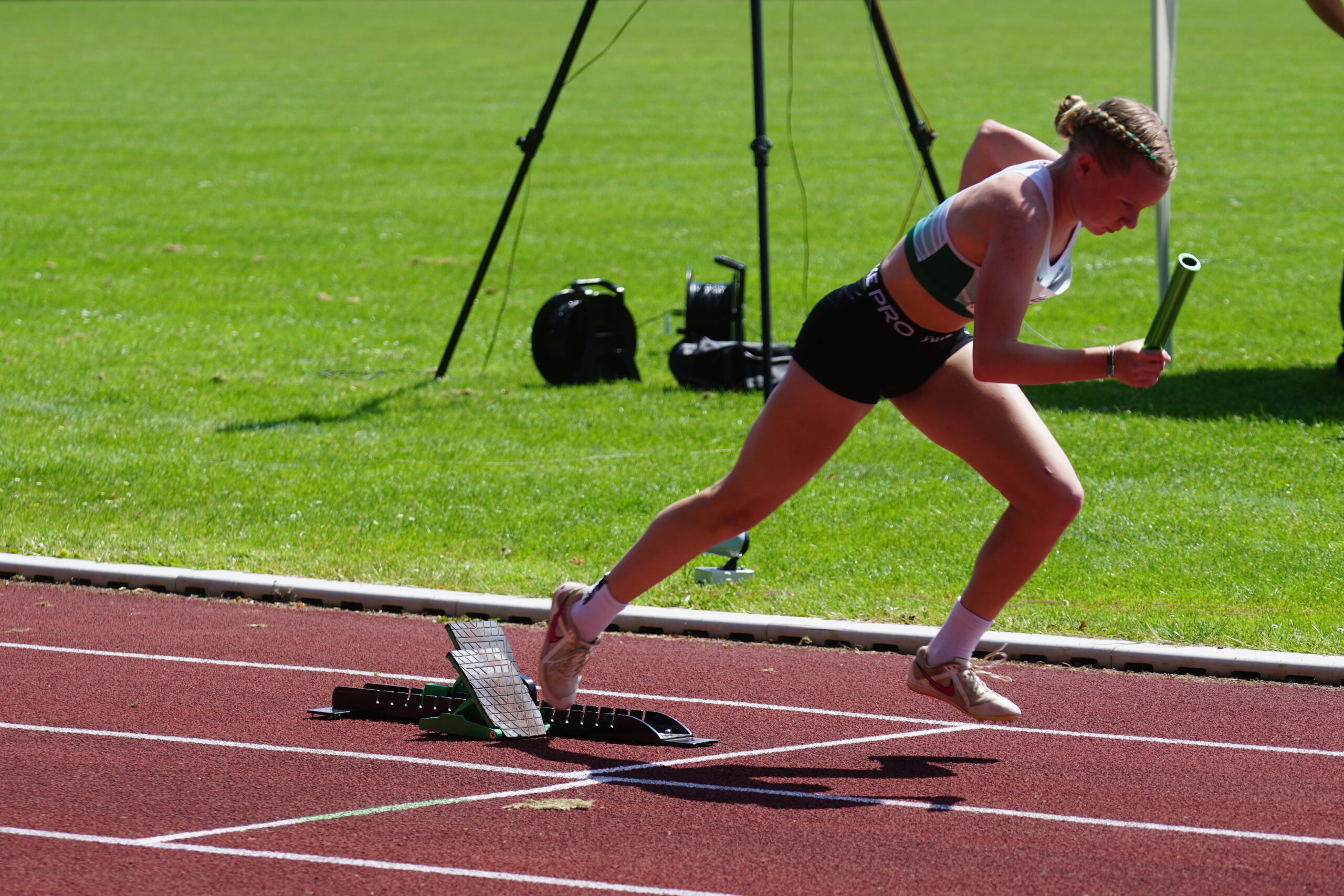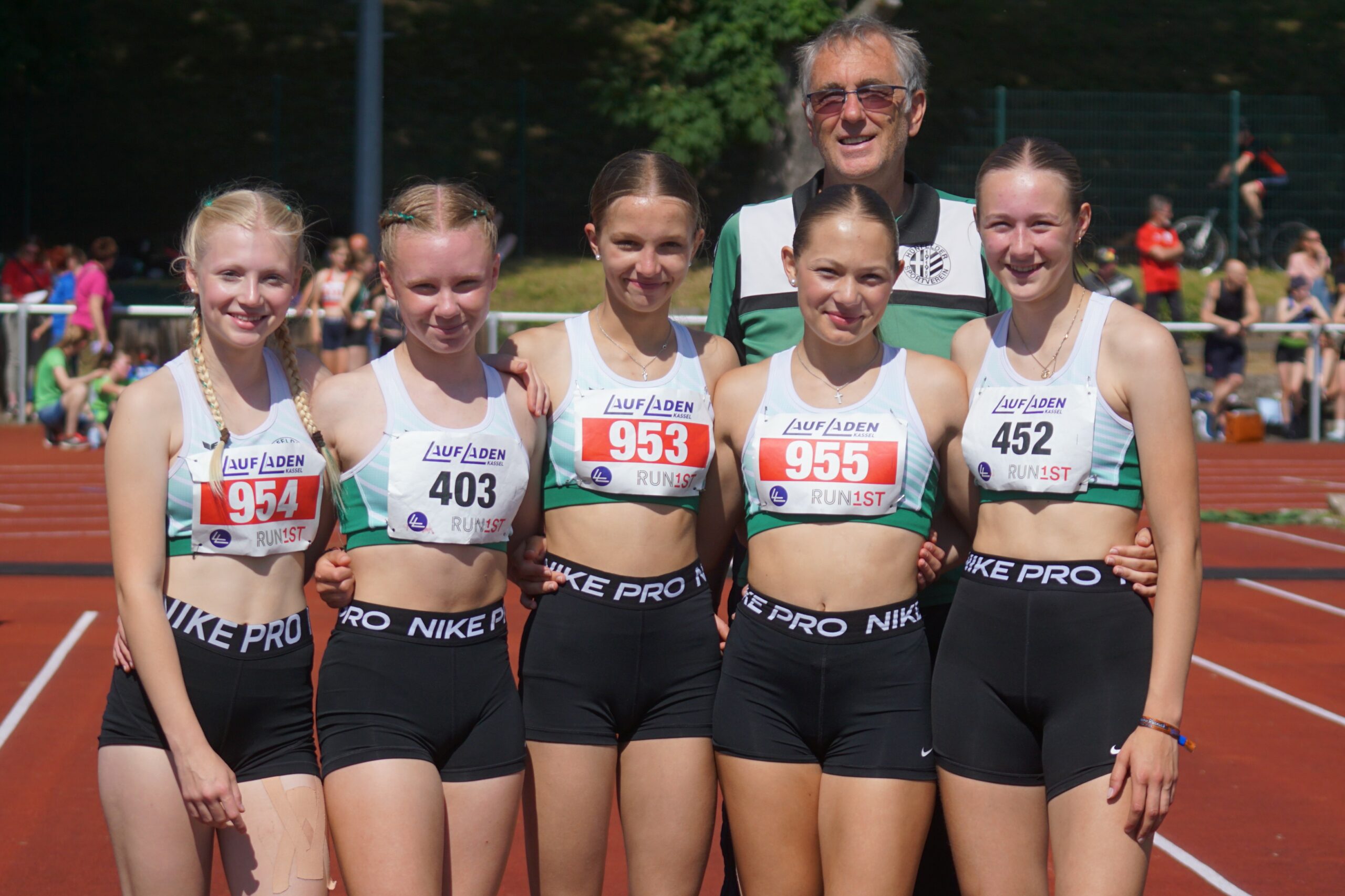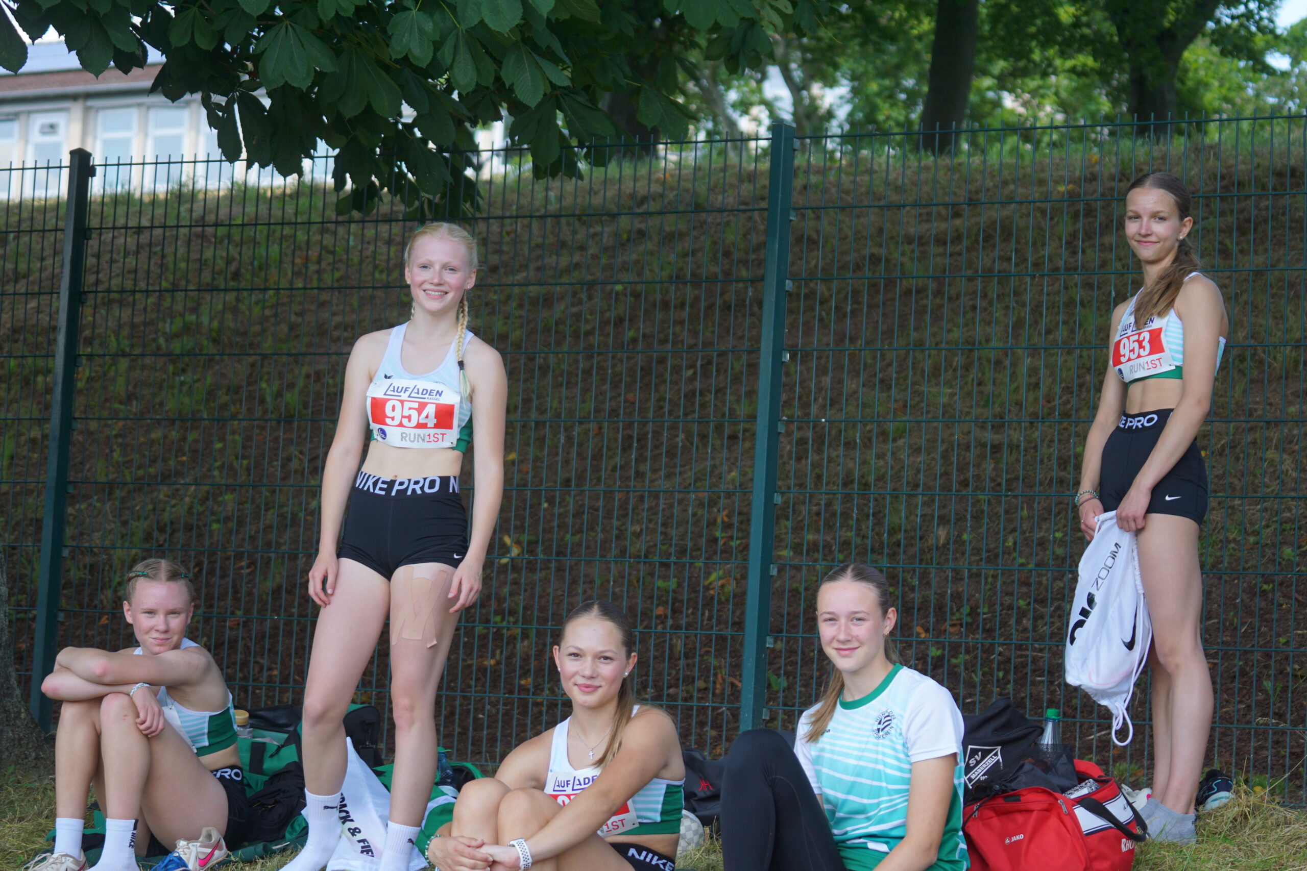Als erstes war die Staffel der Startgemeinschaft „Hünfeld-Neuhof-Flieden“ in der Besetzung „Lilli Roth, Emma Röhrdanz, Lilianna Zirpel, Hanna Knieper“ (Hanna vom TV Jahn Neuhof, der Rest Hünfelder SV) dran. Von den Meldezeiten ausgehend war klar, dass es für unsere Staffel ein einsames Rennen werden würde. Und so war es dann auch. Die gelaufene Zeit von 50,21 Sekunden entspricht in der Deutschen Bestenliste Platz „8“! Und mit den Wechseln waren die Mädels alles andere als zufrieden! Ja, und da haben sie recht, da ist noch einiges an Zeit liegen geblieben. Aber 2 der 3 Wechsel hatten wir auch noch nicht geübt, hatten wir neue Wechselpartner zugeordnet. Mit richtig eingeübten Wechseln wäre heute die Zeit mit der unsere erste Staffel auf Platz „3“ der Deutschen Bestenliste gelistet ist unterboten worden.
