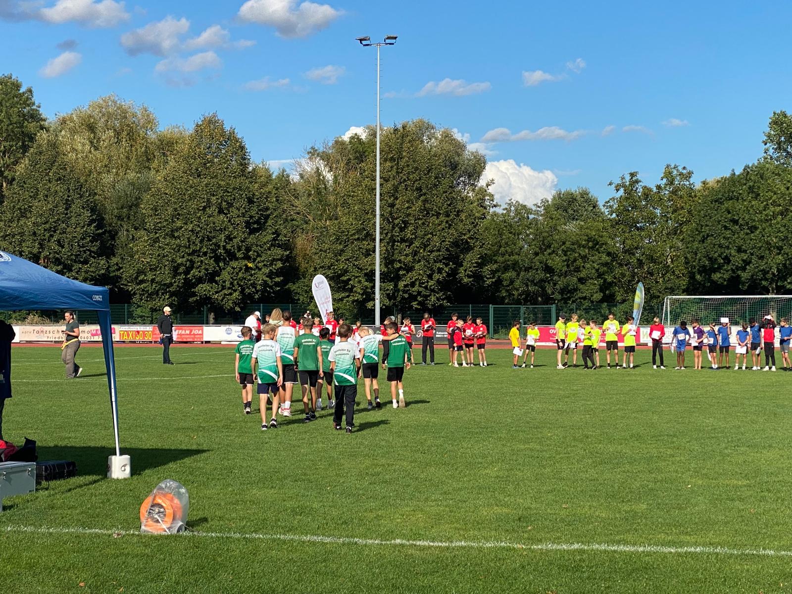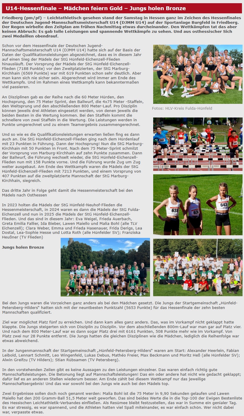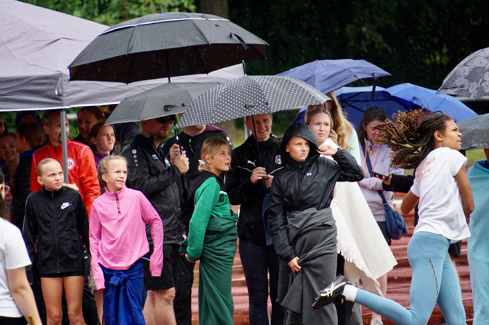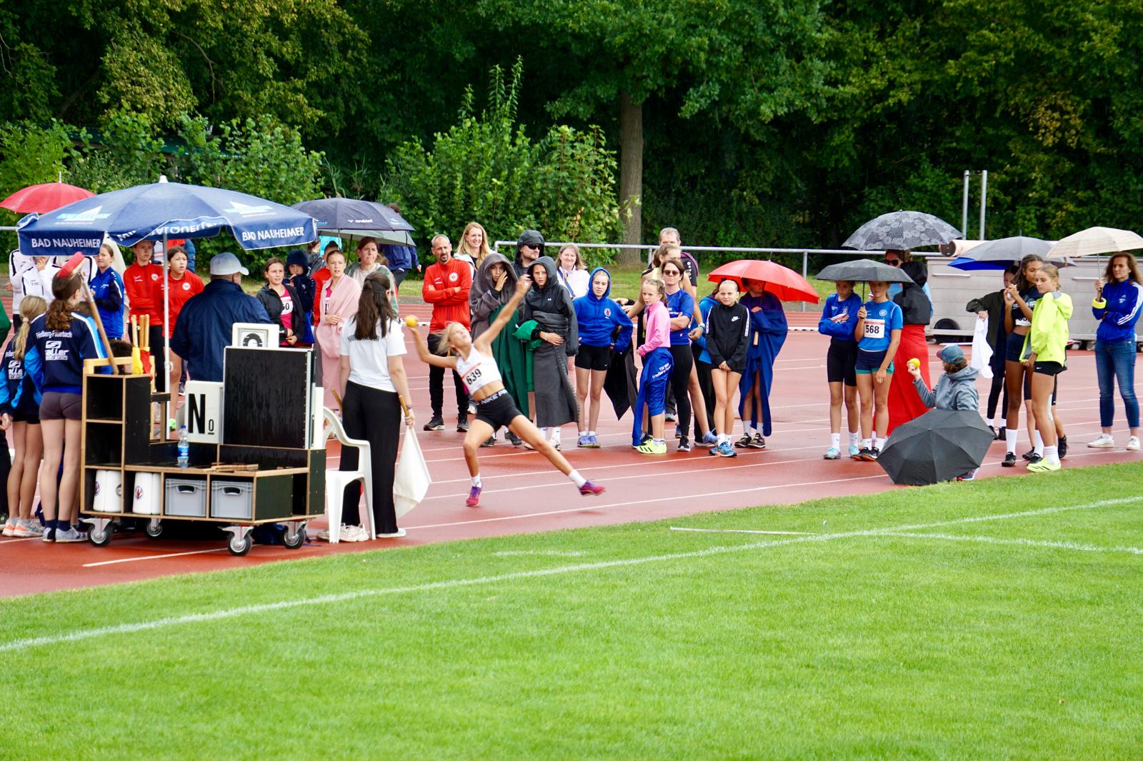 Der heutige Samstag stand leichtathletisch gesehen in Hessen ganz im Zeichen des Hessenfinales der Deutschen Jugend-Mannschaftsmeisterschaft U14 (DJMM U14) auf der Sportanlage Burgfeld in Friedberg. Die Wettervorhersage war nicht sehr verheißungsvoll, und der Regen kam dann auch. Und der wirbelte den Zeitplan dann am frühen Nachmittag auch schon etwas durcheinander. Den Wettkämpfen tat das aber keinen Abbruch. Man sah tolle Leistungen und spannende Wettkämpfe.
