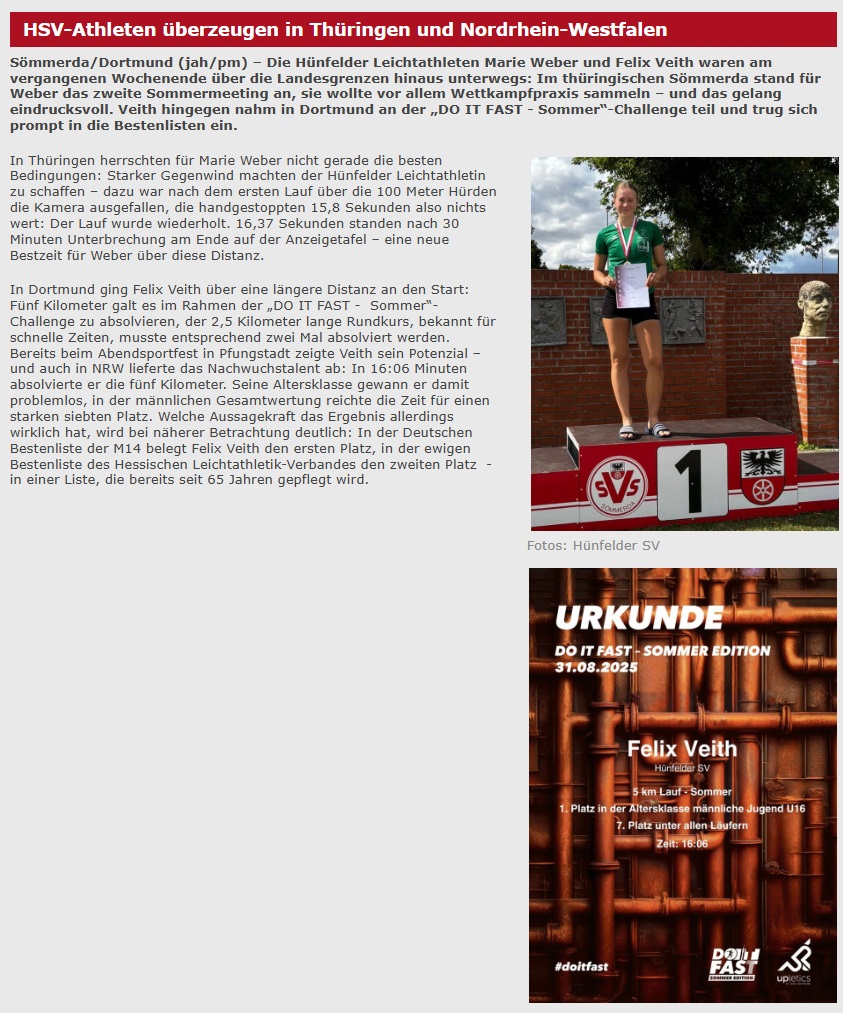 Was für ein erfolgreiches Wochenende bei den Leichtathleten des Hünfelder SV. Während das Hessenfinale des U12-Kinderleichtathletik-Teamwettbewerbs in Griesheim lief war Felix Veith in Dortmund unterwegs.