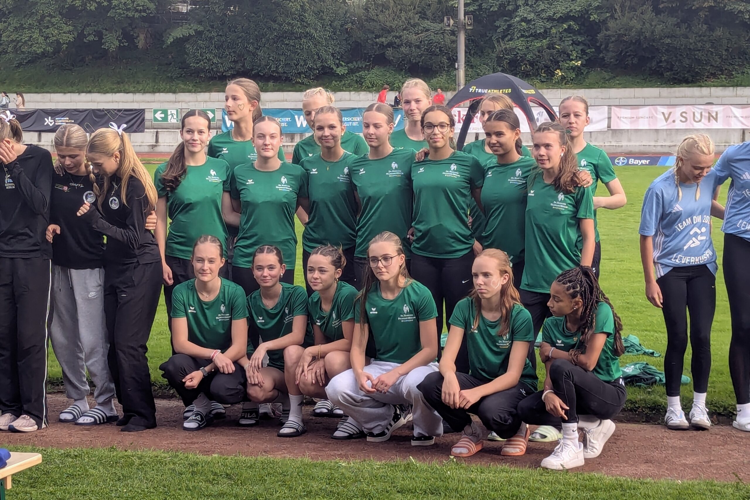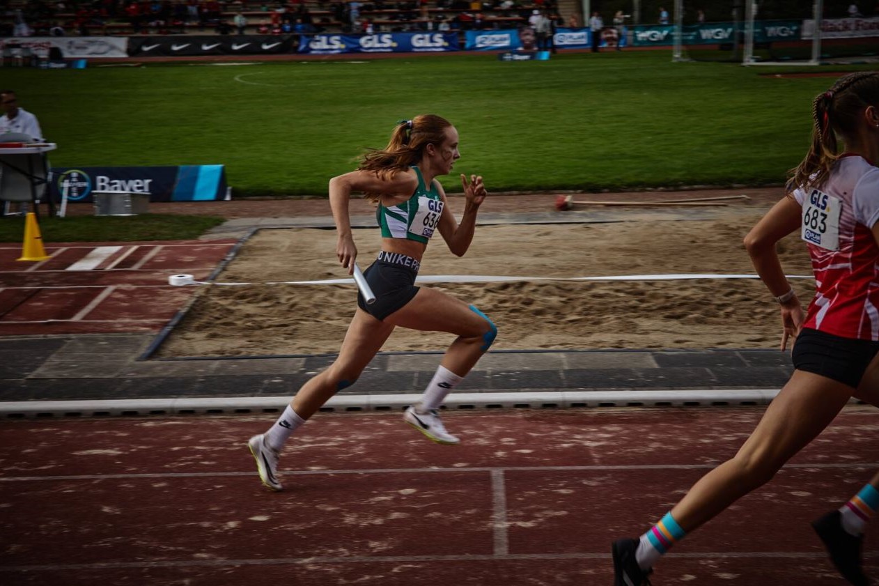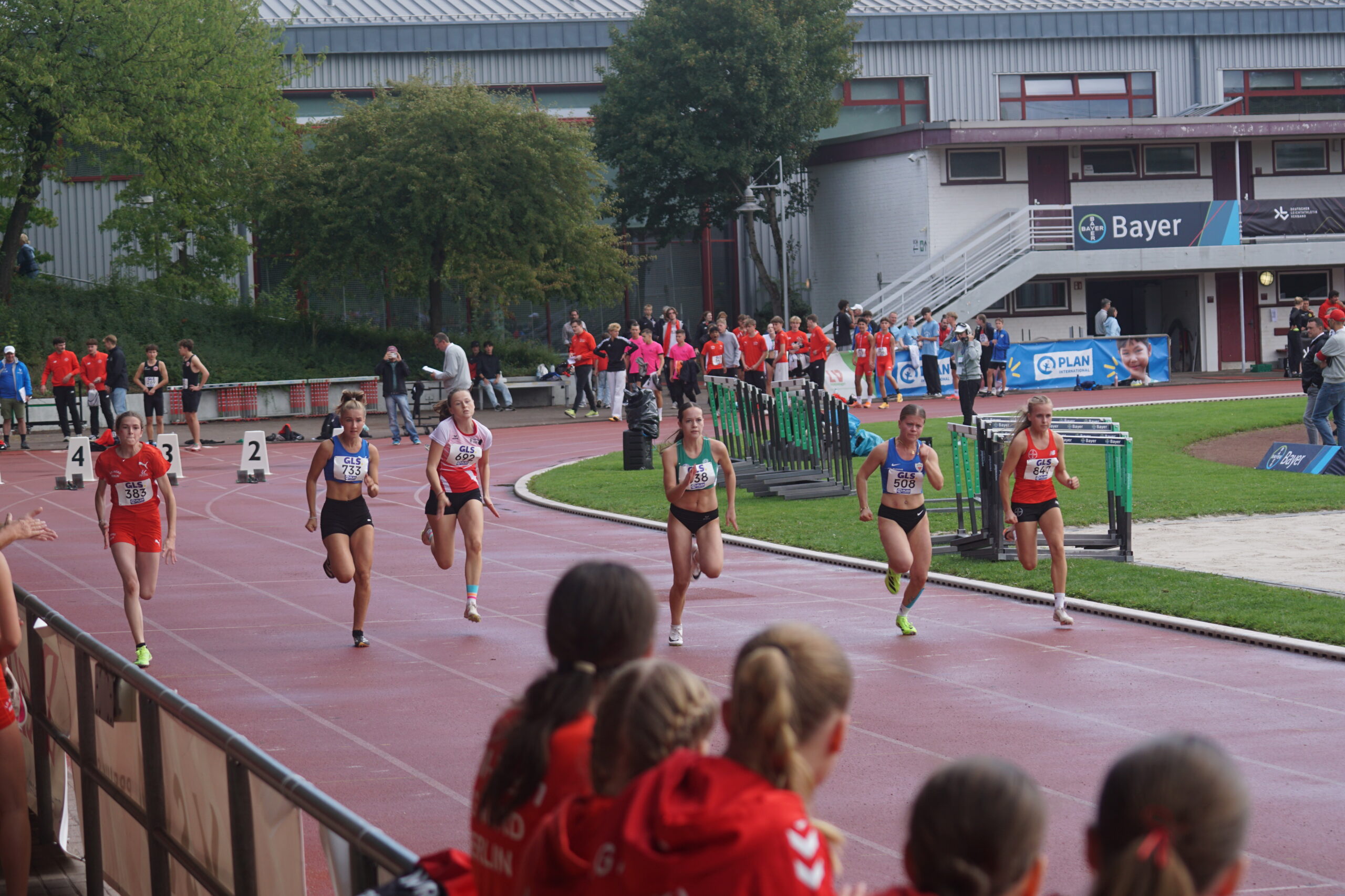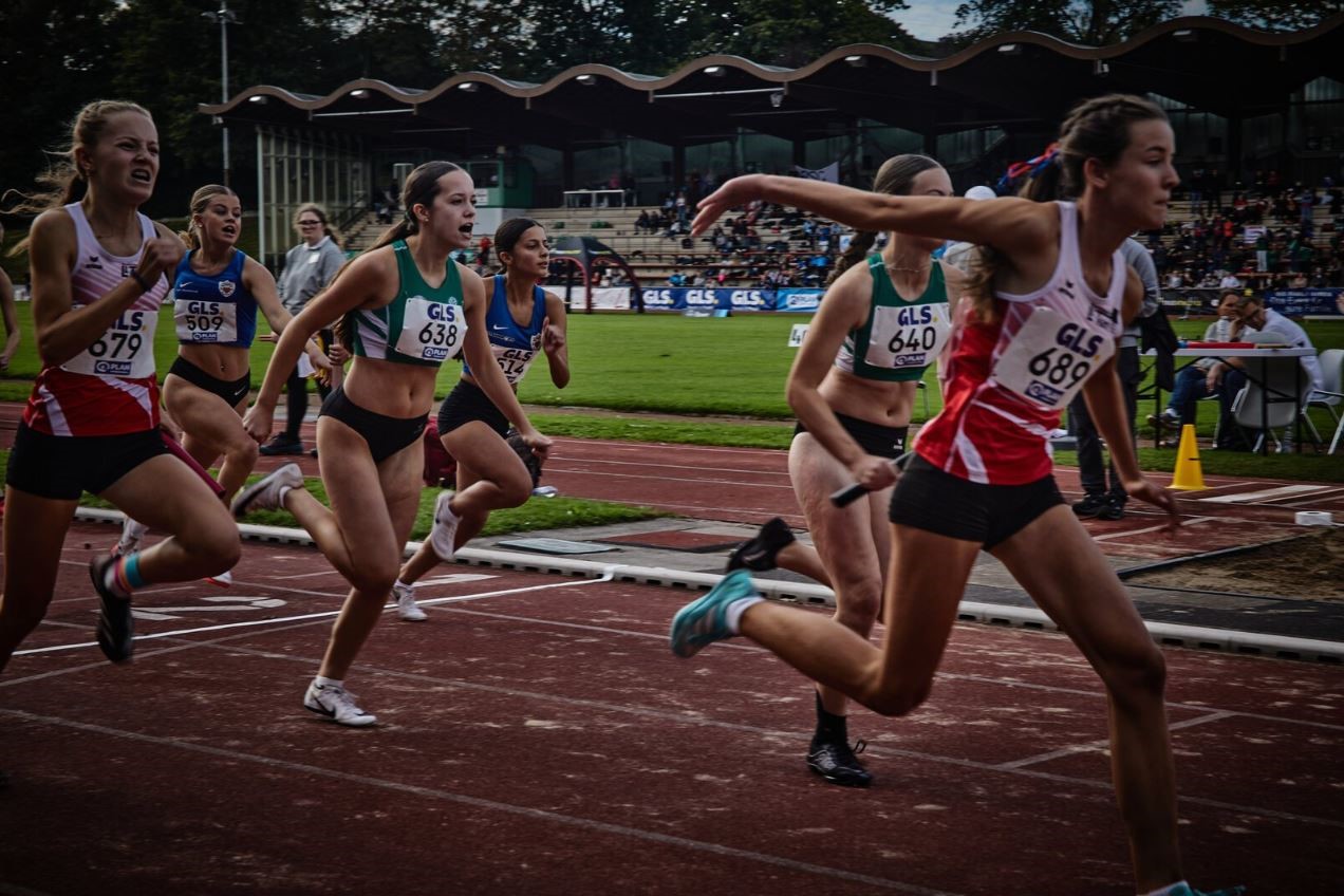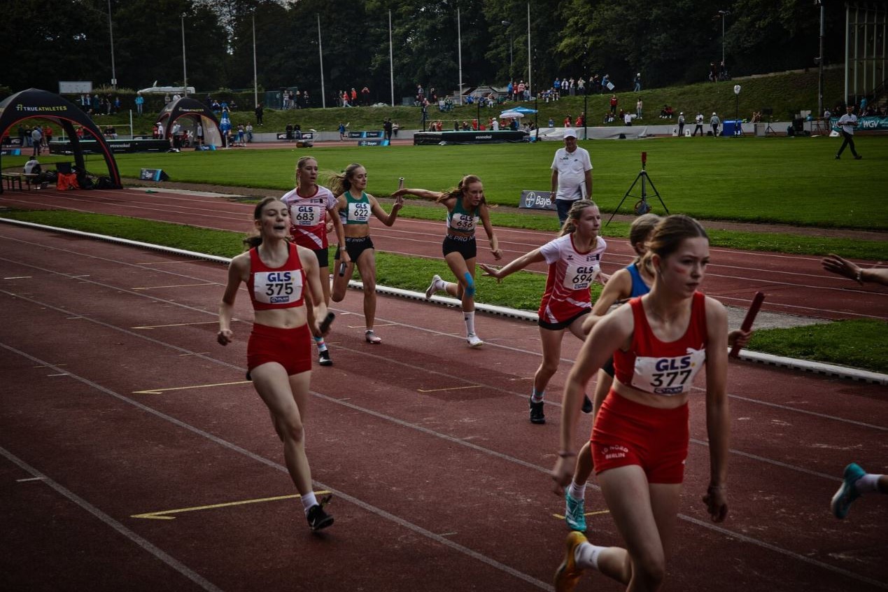 Die abschließende 4x100m-Staffel muss die Entscheidung bringen. Der Startschuss fällt. Die erste Staffel in der Besetzung Nika Marie Henkel, Lotte Schwarz, Svea Witzel und Emma Röhrdanz mit Platz 2; die zweite Staffel in der Besetzung Malia Bohl, Frieda Auerbach, Lotta Roth und Lawen Maiello auf Platz 9.