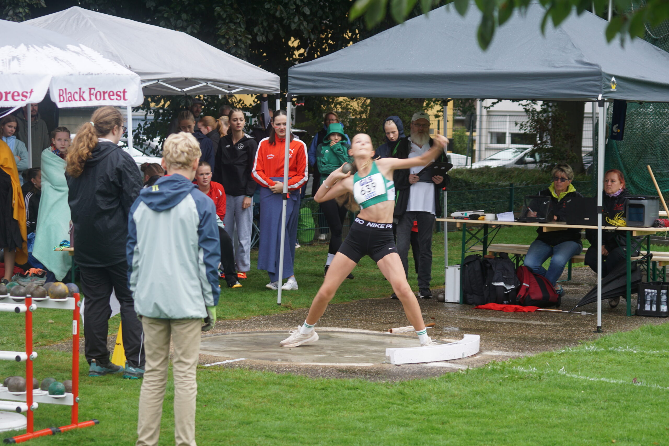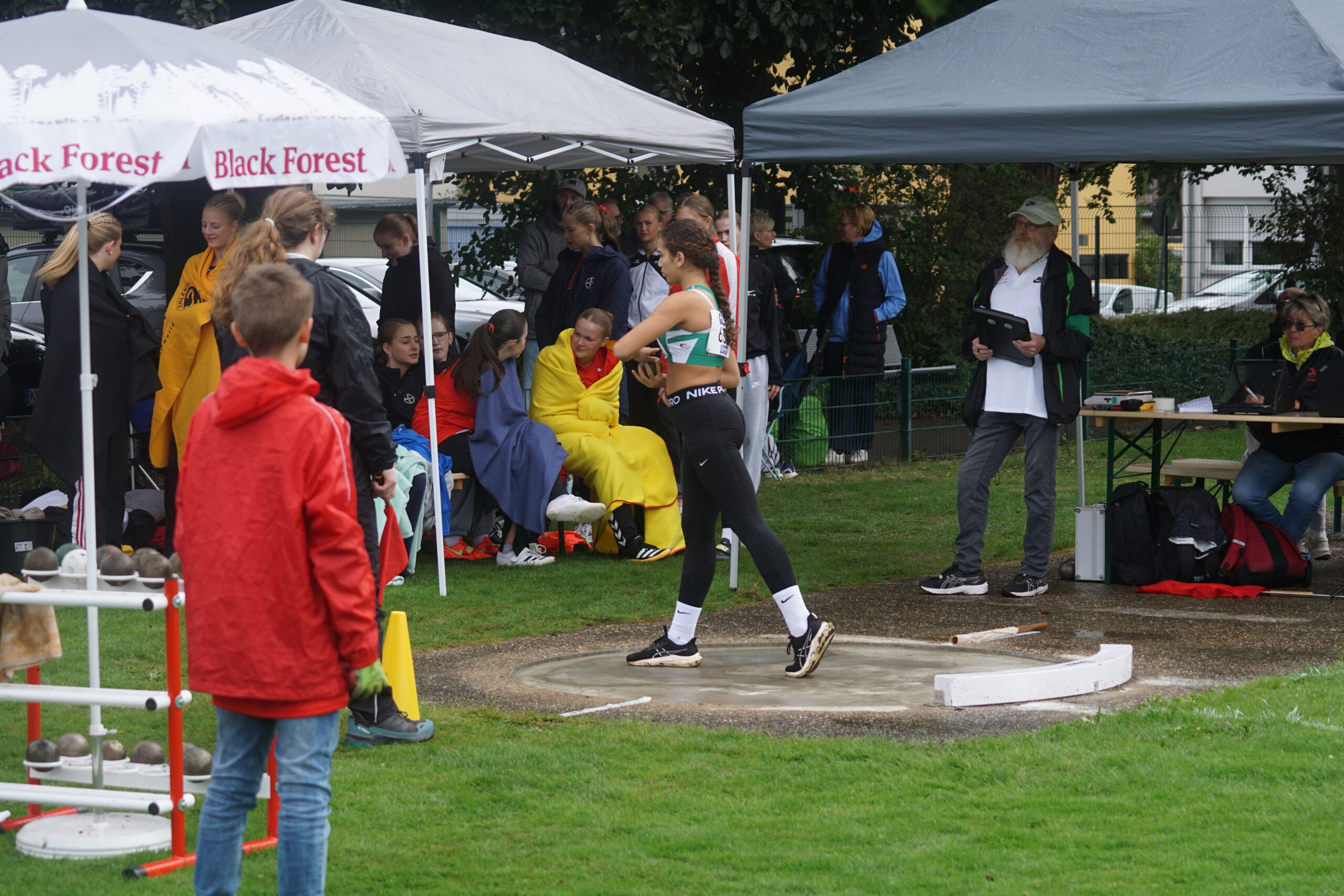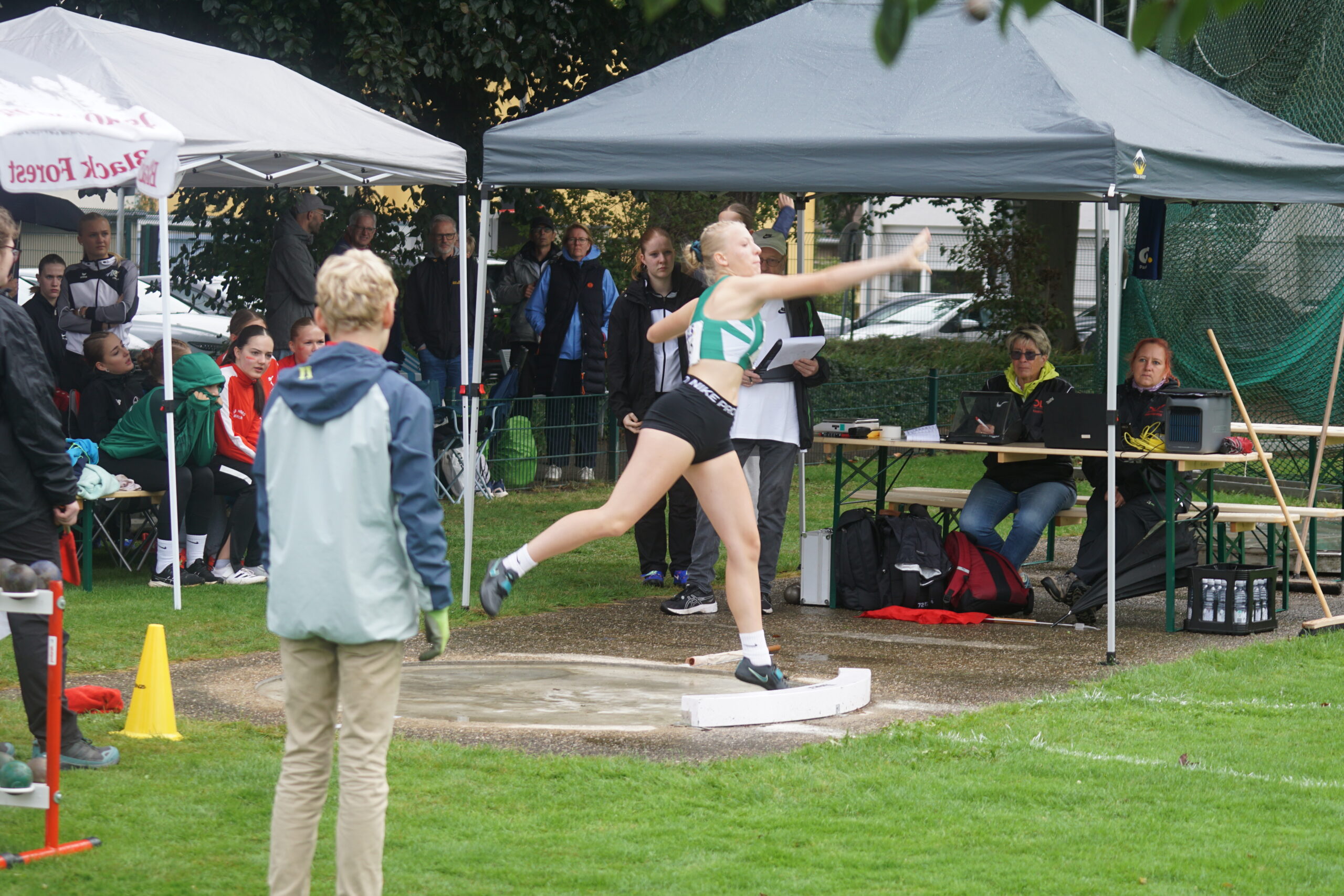 Als nächstes wird der Diskuswurf fertig, eigentlich der Hochsprung, aber der Zeitplan ist, wie auch im letzten Jahr, etwas durcheinandergeraten! Lena Dehler, Marielle Beckmann und Mara Gutermuth auf den Plätzen 4, 12 und 15. In der Gesamtwertung wir weiter auf Platz 4! Lena und Mara mit neuen Bestleistungen, 29,05m bzw. 24,50m