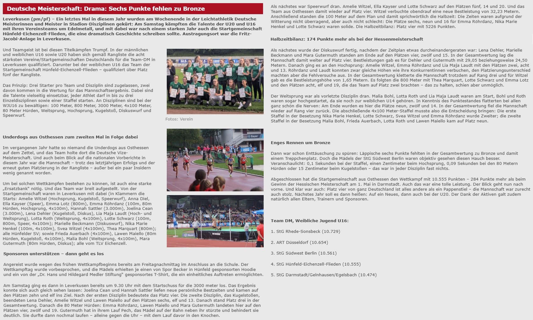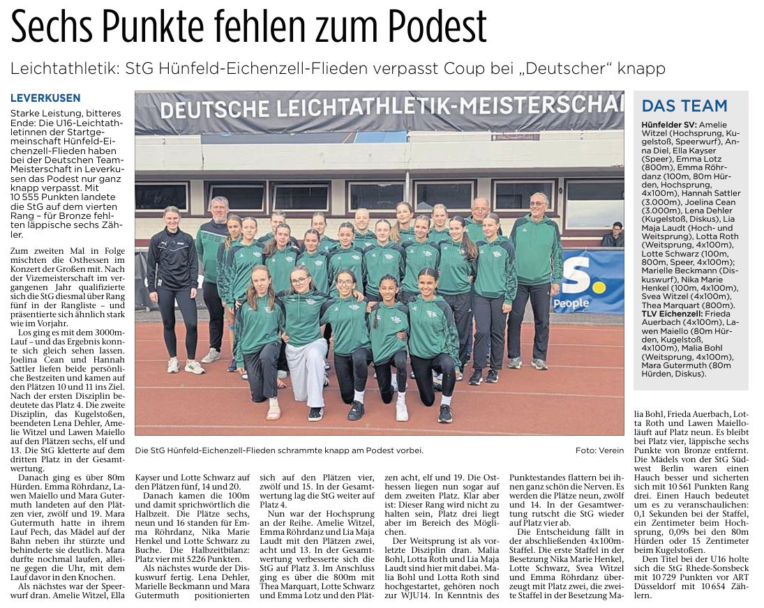 Teamgeist ist bei diesen Titelkämpfen Trumpf. In der männlichen und weiblichen U16 sowie U20 haben sich gemäß Rangliste die acht stärksten Vereine/Startgemeinschaften Deutschlands für die Team-DM in Leverkusen qualifiziert. Darunter bei der weiblichen U16 das Team der Startgemeinschaft Hünfeld-Eichenzell-Flieden – qualifiziert über Platz 5 der Rangliste.