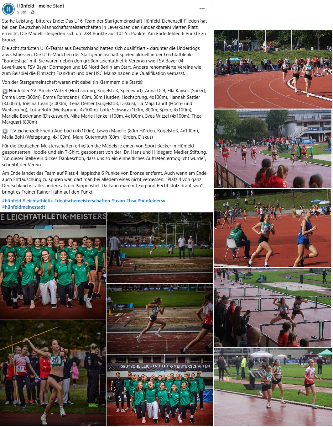 - Amelie Witzel (Hochsprung, Kugelstoß, Speerwurf), Anna Diel, Ella Kayser (Speer), Emma Lotz (800m), Emma Röhrdanz (100m, 80m Hürden, Hochsprung, 4x100m), Hannah Sattler (3.000m), Joelina Cean (3.000m), Lena Dehler (Kugelstoß, Diskus), Lia Maja Laudt (Hoch- und Weitsprung), Lotta Roth (Weitsprung, 4x100m), Lotte Schwarz (100m, 800m, Speer, 4x100m); Marielle Beckmann (Diskuswurf), Nika Marie Henkel (100m, 4x100m), Svea Witzel (4x100m), Thea Marquart (800m); alle Hünfelder SV