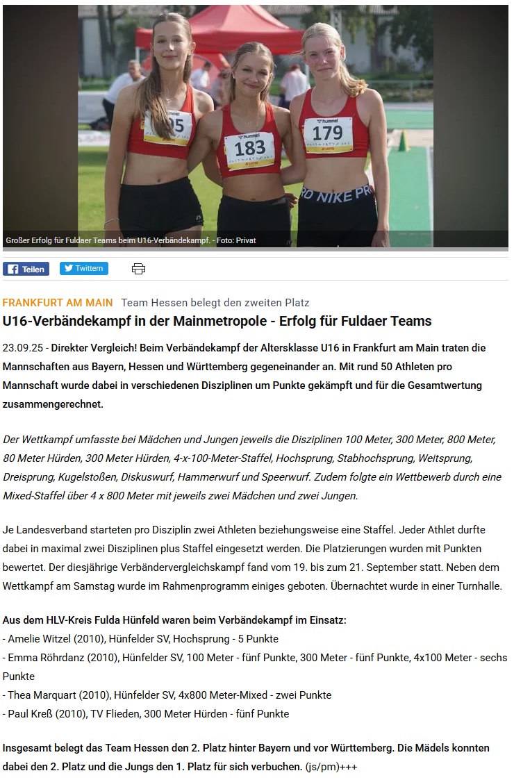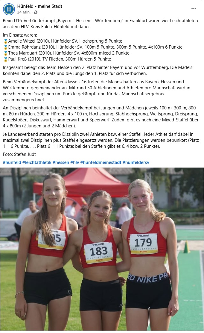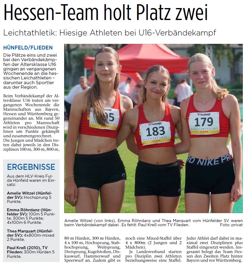 Vom Hünfelder SV waren beim Verbändekampf mit Amelie Witzel (Hochsprung), Emma Röhrdanz (100m, 300m und 4 x 100m-Staffel) und Thea Marquart (4 x 800m-Mixed-Staffel) 3 Athletinnen im Einsatz!