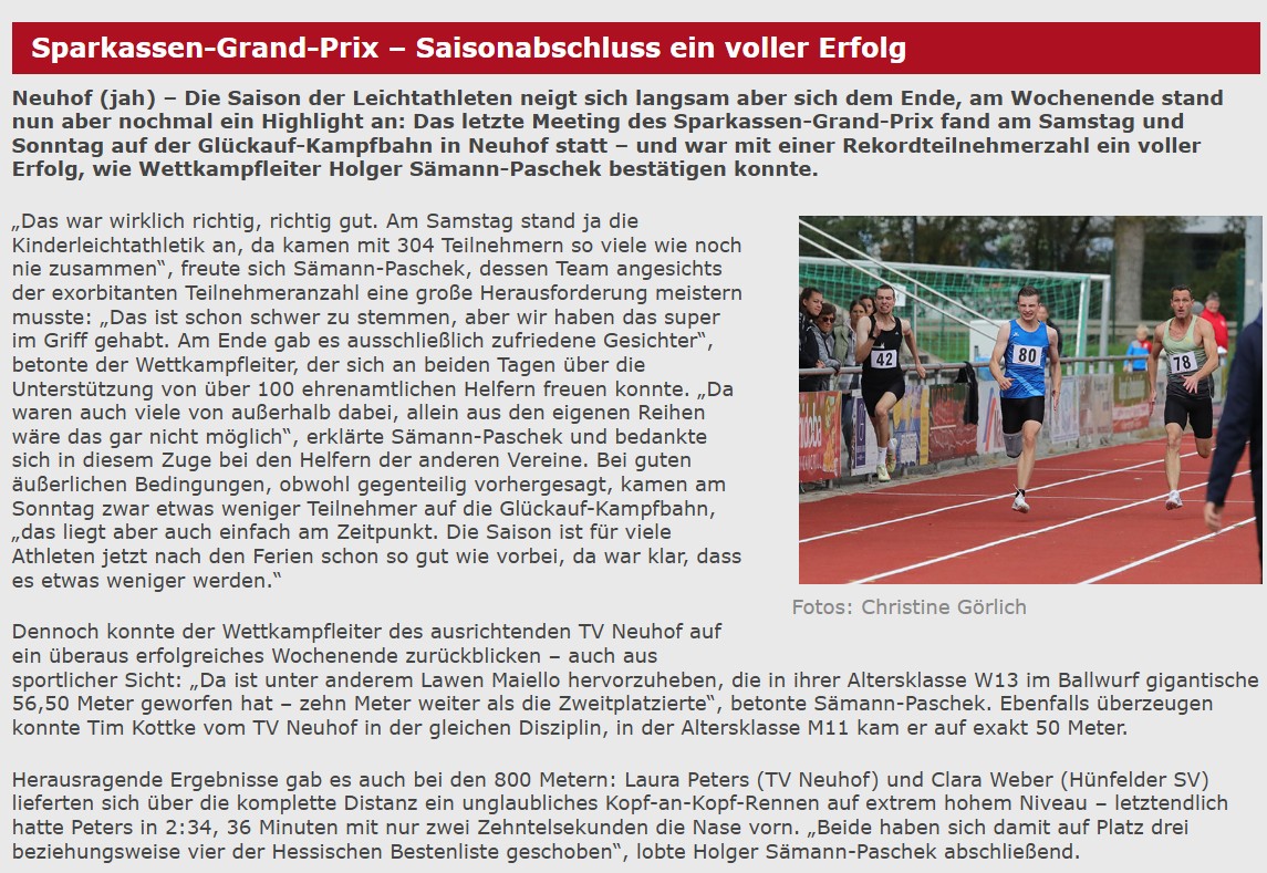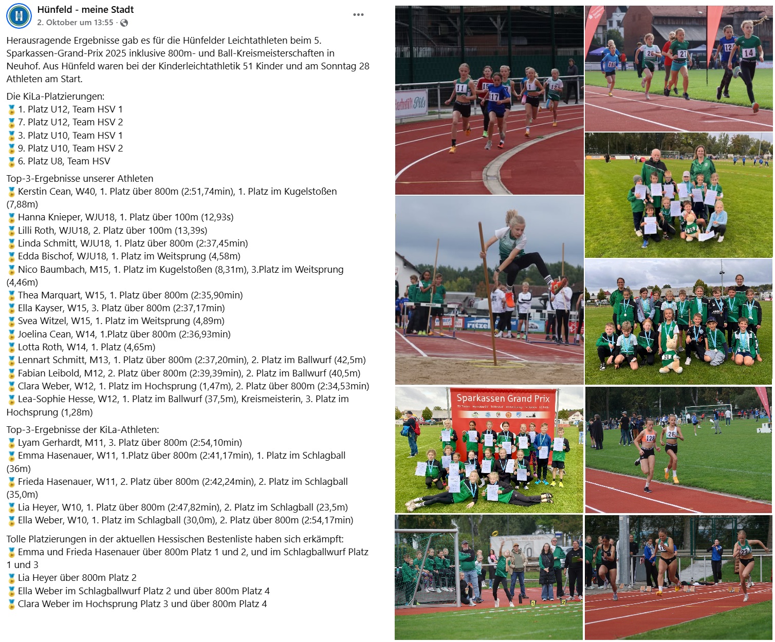 Im Neuhofer Glück-auf-Stadion in Neuhof fand am gestern und heute 5. und damit auch letzte Sparkassen-Grand-Prix 2025 mit 421 Sportlern aus 21 Vereinen aller Altersklassen statt. Bei gutem leichtathletik-Wetter konnten die Sportler ihr Können unter Beweis stellen. Während der Samstag alleinig der Kinderleichtathletik vorbehalten war, stand dann der Sonntag voll im Zeichen klassischen Leichtathletik.