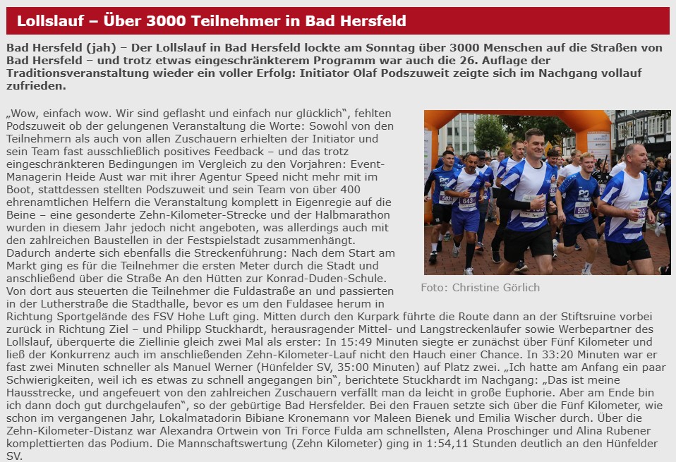 Petrus meinte es wieder sehr gut mit den Startern beim 26. Bad Hersfelder Lollslauf. Am Sonntagvormittag und -mittag gehörte die Bad Hersfelder Innenstadt den Läufern und ihren Fans; der Lollslauf war wie jedes Jahr eine Veranstaltung für die ganze Familie. Die durch viele Baustellen verursachte neue Streckenführung und das ebenfalls durch die vielen Baustellen etwas eingeschränkte Angebot taten dem keinen Abbruch. Besonders am Zieleinlauf, auf dem Bad Hersfelder Lingplatz, standen die Zuschauer Schulter an Schulter und feuerten die Läufer bis zum Überqueren der Ziellinie an.