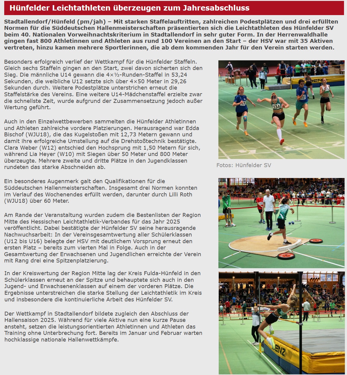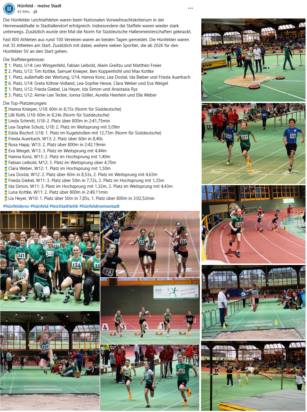 An diesem Wochenende war in der Leichtathletikhalle in Stadtallendorf mächtig was los. Fast 800 Athleten aus rd. 100 Vereinen waren gemeldet. Wir waren mit 35 Athleten am Start. Zusätzlich mit dabei, weitere „7“, die ab dem 01.01.2026 für den Hünfelder SV an den Start gehen!
