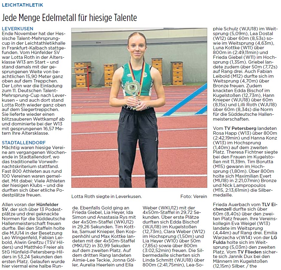 Ab dem 01.01.2025 starten acht Mädels neu für den Hünfelder SV. Sieben dieser Mädels, Hanna Konz und Rosa Happ (beide TV Petersberg) sowie Emilie Auerbach, Eva Weigel, Frieda Auerbach, Ida Bieber und Mattea Auerbach (alle TLV Eichenzell) waren in Stadtallendorf noch für ihre bisherigen Vereine am Start. Um das, was diese Mädels zu leisten in der Lage sind zu zeigen haben wir sie in diesem Artikel miterfasst!