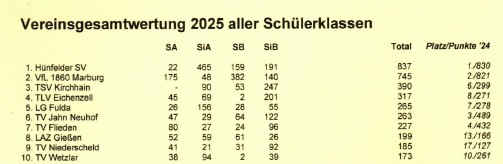 Am Rande des 40. Nationalen Vorweihnachtskriteriums in der Herrenwaldhalle in Stadtallendorf wurden auch die Bestenlisten der Region Mitte des Hessischen Leichtathletik-Verbandes verteilt. Und mit dem, was man dann in der Vereinsgesamtwertung 2025 aller Schülerklassen zu sehen bekam damit hatte wie schon im vergangenen Jahr niemand beim Hünfelder SV gerechnet. Der Hünfelder SV steht hier mit 837 (830) Punkten erneut auf Platz „1“! Es folgen mit einem kleinem Abstand auf Platz „2“ der VfL 1860 Marburg mit 745 Punkten! Dann folgen auf den Plätzen 3 und 4 der TSV Kirchhain mit 390 und der TLV Eichenzell mit 317 Punkten.