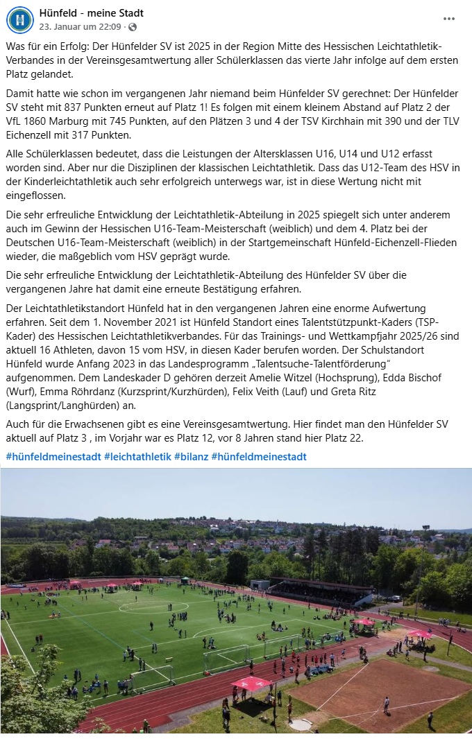 Man muss sich in diesem Zusammenhang auch immer wieder in Erinnerung rufen, welche Aufwertung der Leichtathletik-Standortes Hünfeld erfahren hat. Seit dem 1. November 2021 ist Hünfeld Standort eines Talentstützpunkt-Kaders (TSP-Kader) des Hessischen Leichtathletikverbandes. Für das Trainings- und Wettkampfjahr 2025/26 sind aktuell 16 Athleten, davon 15 vom Hünfelder SV, in diesen Kader berufen worden. Der Schulstandort Hünfeld wurde Anfang 2023 in das Landesprogramm „Talentsuche-Talentförderung“ aufgenommen.