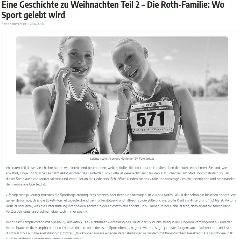 Gestern bzw. heute sind in der Fuldaer Zeitung bzw. beim brandneuen Online-Portal Osthessenreport.de zwei Familiengeschichten zu Weihnachten über sportliche Familien, die Kottkes und die Roths, veröffentlicht worden, die auch einen kräftigen Bezug zur Leichtathletik des Hünfelder SV haben. Artikel, die in solcher Form mit Bezug zur Leichtathletik nur äußerst selten zu finden sind. Durch Anklicken der nachfolgenden Seiten gelangt man direkt auf die dann lesbaren Artikel!