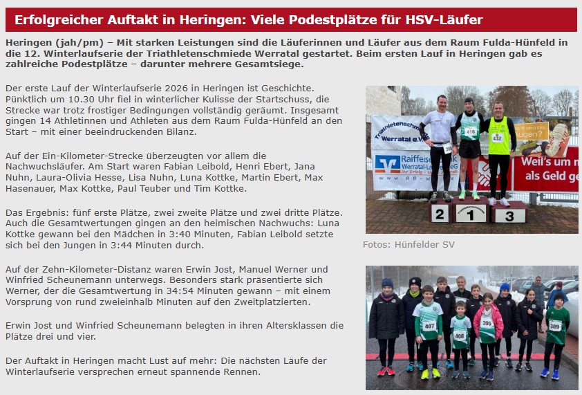 Das erste Kapitel der 12.Winterlaufserie der Triathletenschmiede Werratal e.V. in 2026, der 1. Lauf ist Geschichte! Pünktlich um 10:30 Uhr erfolgte in winterlicher Umgebung der erste Startschuss. Die Strecke war komplett geräumt! Und dem Wetter geschuldet sah man heute bei unseren Athleten auch nicht so viel „GRÜN“; dafür waren aber einige der schwarzen Winterjacken gut mit dem HSV-Logo zu erkennen!