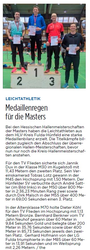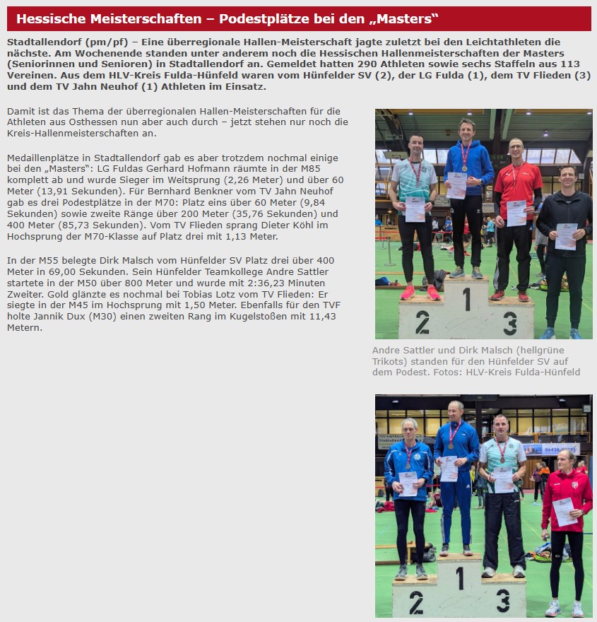 Gemeldet für die Hessischen Hallenmeisterschaften der Masters hatten 290 Athleten sowie 6 Staffeln aus 113 Vereinen. Der Hünfelder SV war mit 2 Athleten vertreten, André Sattler und Dirk Malsch waren am Start.