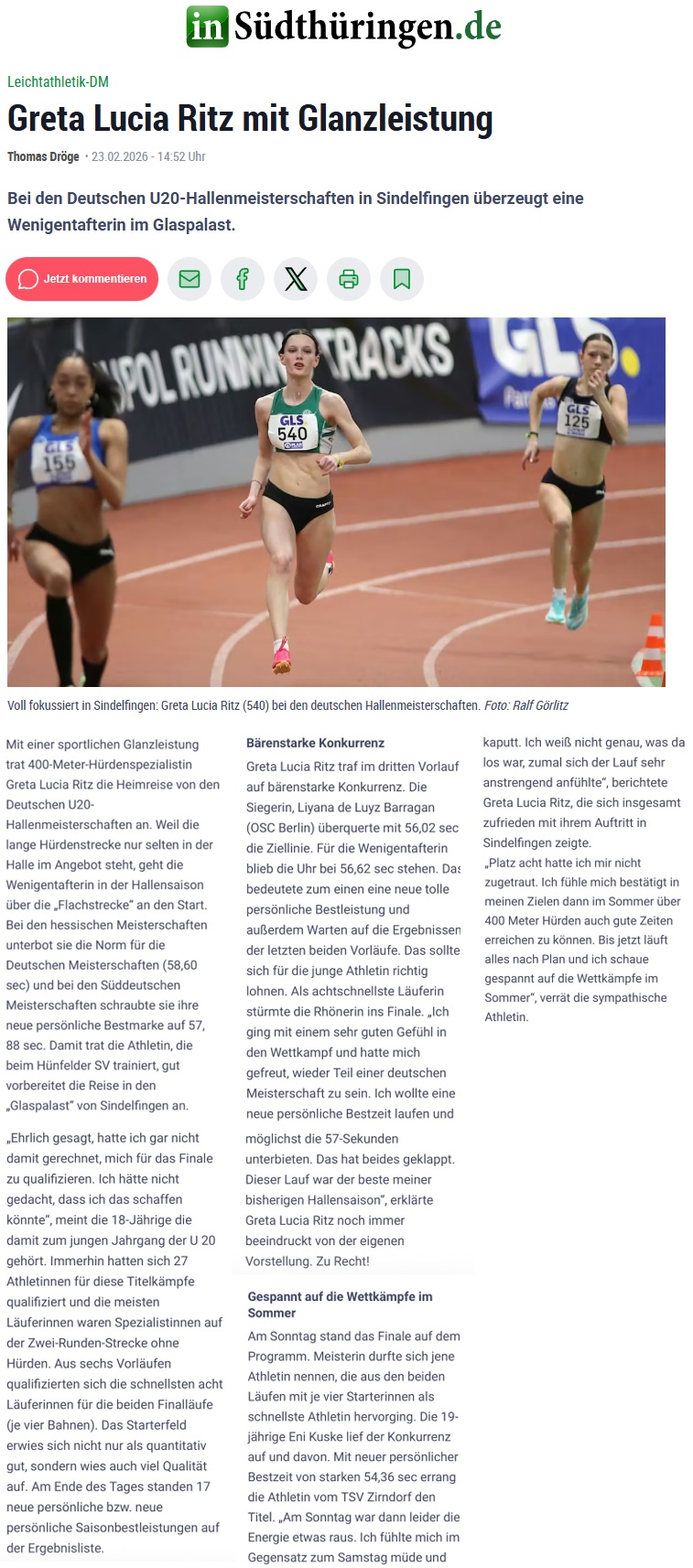 Am Ende des Titelkampfs über die 400m bei der WJU20 standen 15 neue persönliche Bestzeiten auf dem konnte der gestarteten Athletinnen. Auch das zeugt von der Qualität der Rennen. Greta selbst hat sich innerhalb Jahresfrist um über 3 Sekunden über die 400m gesteigert, das ist eine ganze Menge, eine kleine Welt! Man darf bei Greta auf die Wettkämpfe im Sommer gespannt sein. Dann, die Langhürden, über 400m, aber mit 10 zu überlaufenden Hürden bestückt. Die Hallenzeiten lassen auf alle Fälle gutes erwarten!