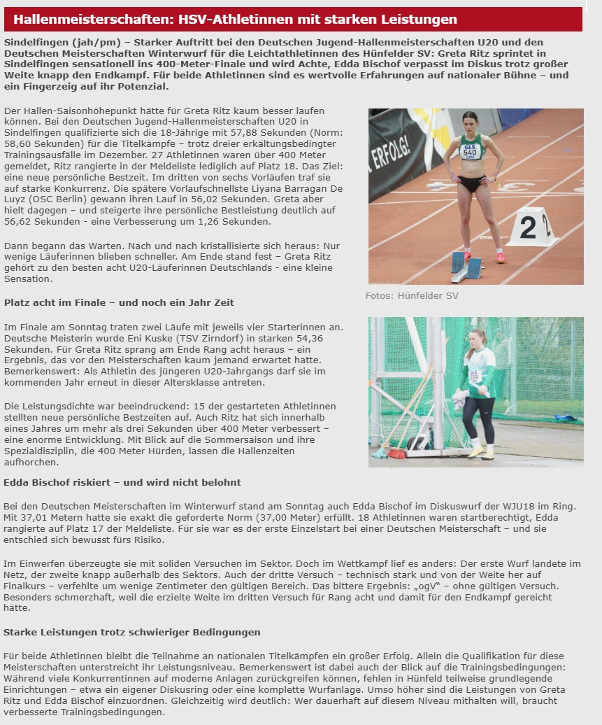 Sindelfingen! Hallen-Saison-Höhepunkt für Greta Ritz und Edda Bischof! Für Greta bei den Deutsche Jugend-Hallenmeisterschaften U20, für Edda bei den Deutsche Meisterschaften Winterwurf.