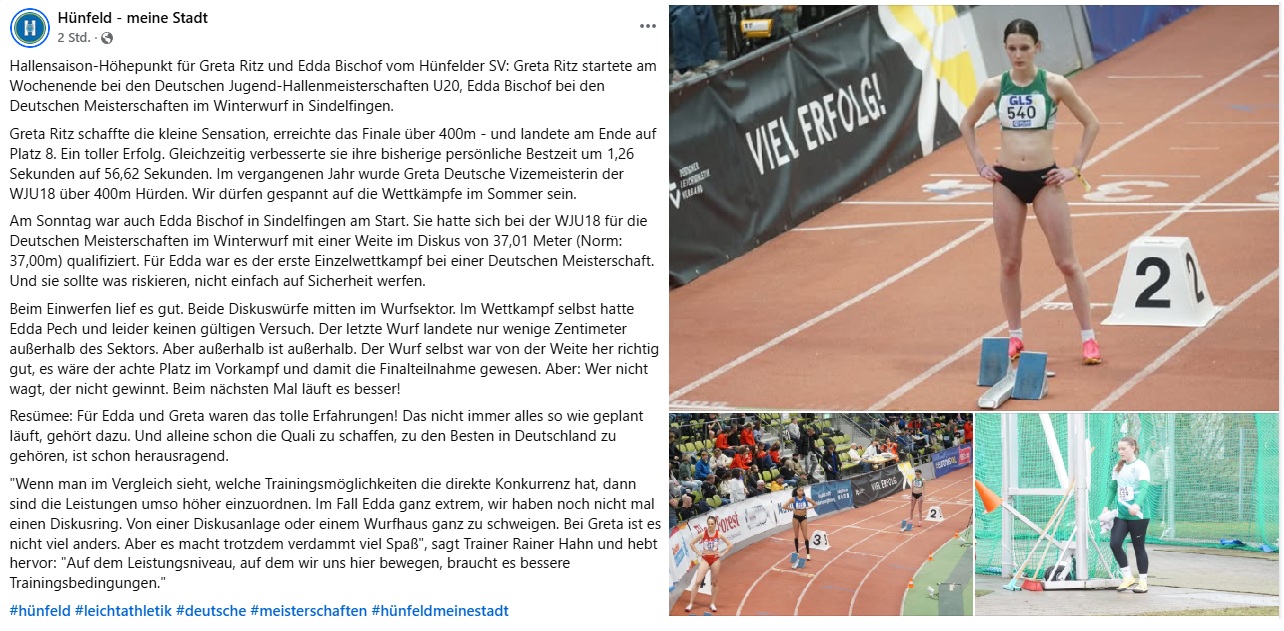 Am Sonntag waren dann zwei vom Hünfelder SV in Sindelfingen am Start. Edda Bischof hatte sich bei der WJU18 für die Deutschen Meisterschaften im Winterwurf mit einer Weite von 37,01 Meter (Norm: 37,00m) qualifiziert.