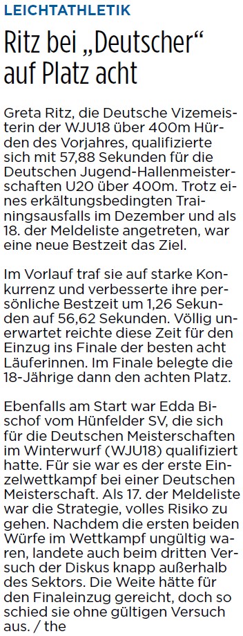 Am vergangenen Samstag war es für die Deutsche Vizemeisterin der WJU18 des vergangenen Jahres über 400m Hürden soweit. Greta hatte sich mit der Zeit von 57,88 Sekunden (Norm: 58,60s) für die Deutschen Jugend-Hallenmeisterschaften U20 qualifiziert. In den letzten Wochen konnte man sehen, wie sich die gelaufenen Zeiten kontinuierlich verbesserten. 3 Wochen erkältungsbedingter Trainingsausfall im Dezember hatten ihre Spuren hinterlassen.