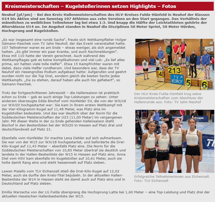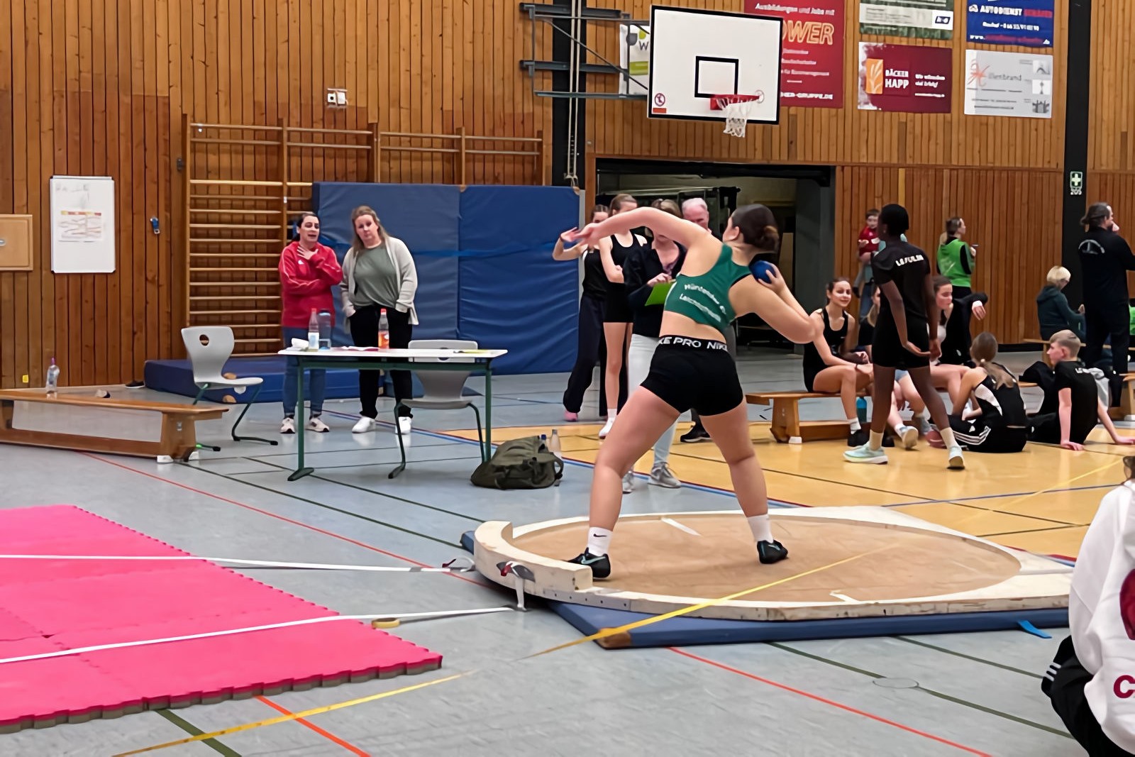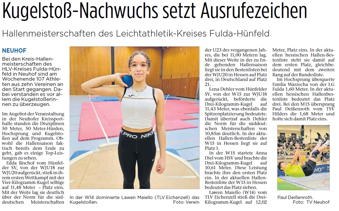 - Lena Dehler, von der W15 zur WJU18 hochgestartet, stößt die 3-Kilogrammkugel auf 11,43 Meter. Die Norm für die Süddeutschen Meisterschaften von 10,85m deutlich übertroffen. In der aktuellen Hallen-Bestenliste der W15 in Hessen auf Platz 1.