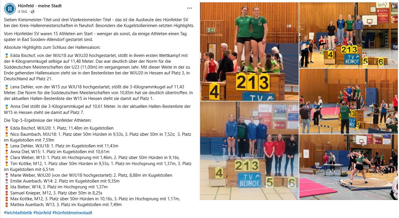 Bei den Kreis-Hallenmeisterschaften des HLV-Kreises Fulda-Hünfeld in Neuhof sind heute 107 Athleten aus 10 Vereinen an den Start gegangen. Vom Hünfelder SV waren 15 Athleten am Start.