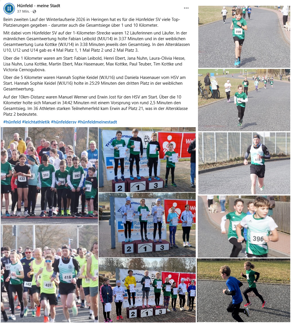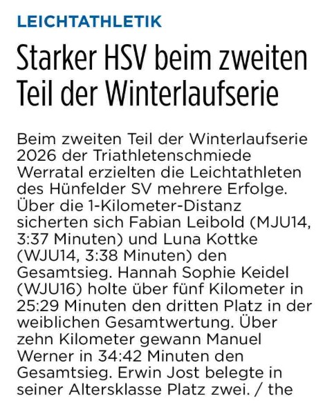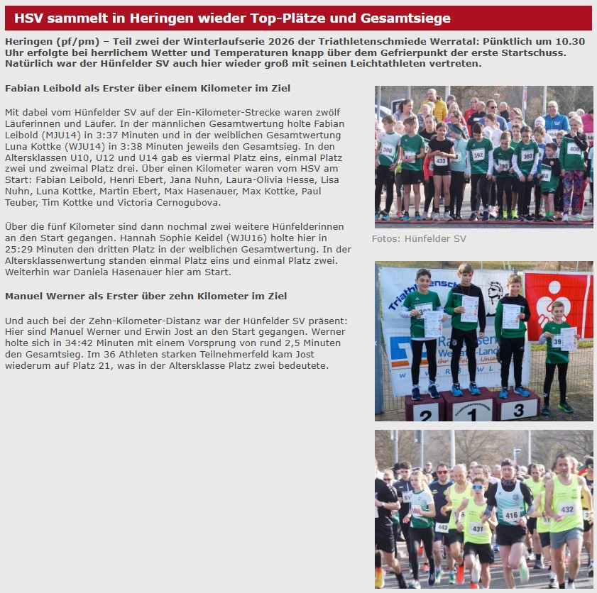 2. Lauf der Winterlaufserie 2026 in Heringen – Viele TOP-Platzierungen für die Leichtathleten vom Hünfelder SV – Gesamtsiege über 1 und 10 Kilometer