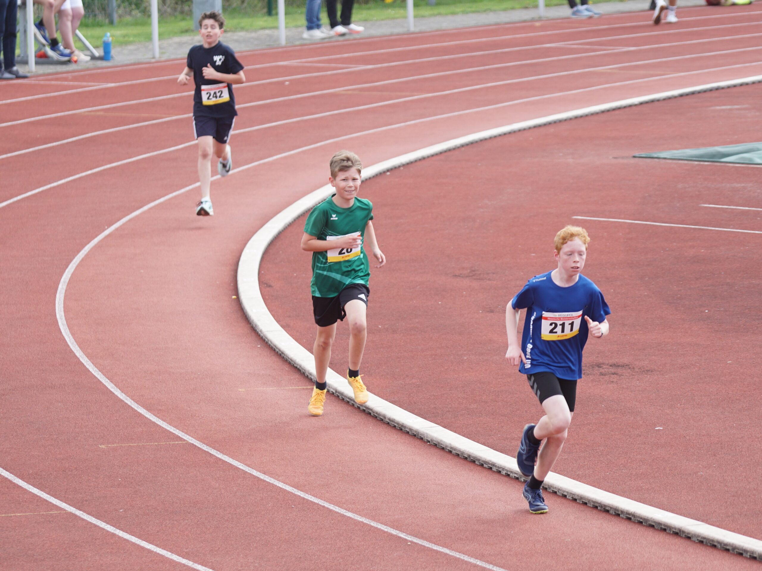 Nach dem Rahmenprogramm kommen auch gleich die Meisterschaftsläufe. Gleich im ersten Lauf ist Max Hasenauer in der Altersklasse M12 über 2.000m am Start. Es wird Platz 12 in 8:15,93 Minuten, die Zeit gegenüber den Regionalmeisterschaften vor einer Woche deutlich verbessert. Tim Kottke musste kurz vor Start passen; die Ferse wollte nicht so recht!