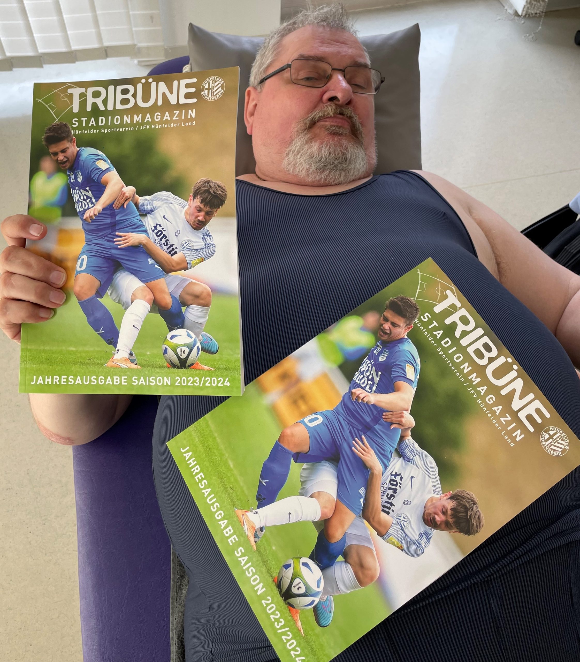 Klaus Schuster ,ein Fan des HSV ,bekommt druckfrisch die Ausgabe 2023/2024 des Tribünenmagazins überreicht 146 Seiten rund um den Hünfelder SV Fussball u. JFV Hünfelder Land , sowie 7 Seiten Leichtathletikerfolge. Die Verteilung erfolgt ab 21.08.2023 -24.08.2023 für die Abonenten der Fuldaer Zeitung