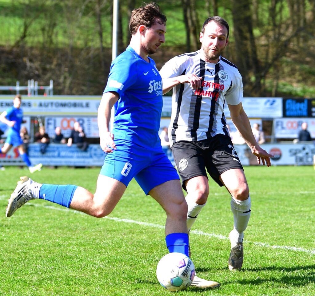 Zweimal: Elfmeter ja oder nein? Rassige Duelle sind in einem Derby programmiert: So wie zwischen Steinbachs Fabian Wiegand (links) und 1:0-Torschütze Andre Vogt. Foto: Siggi