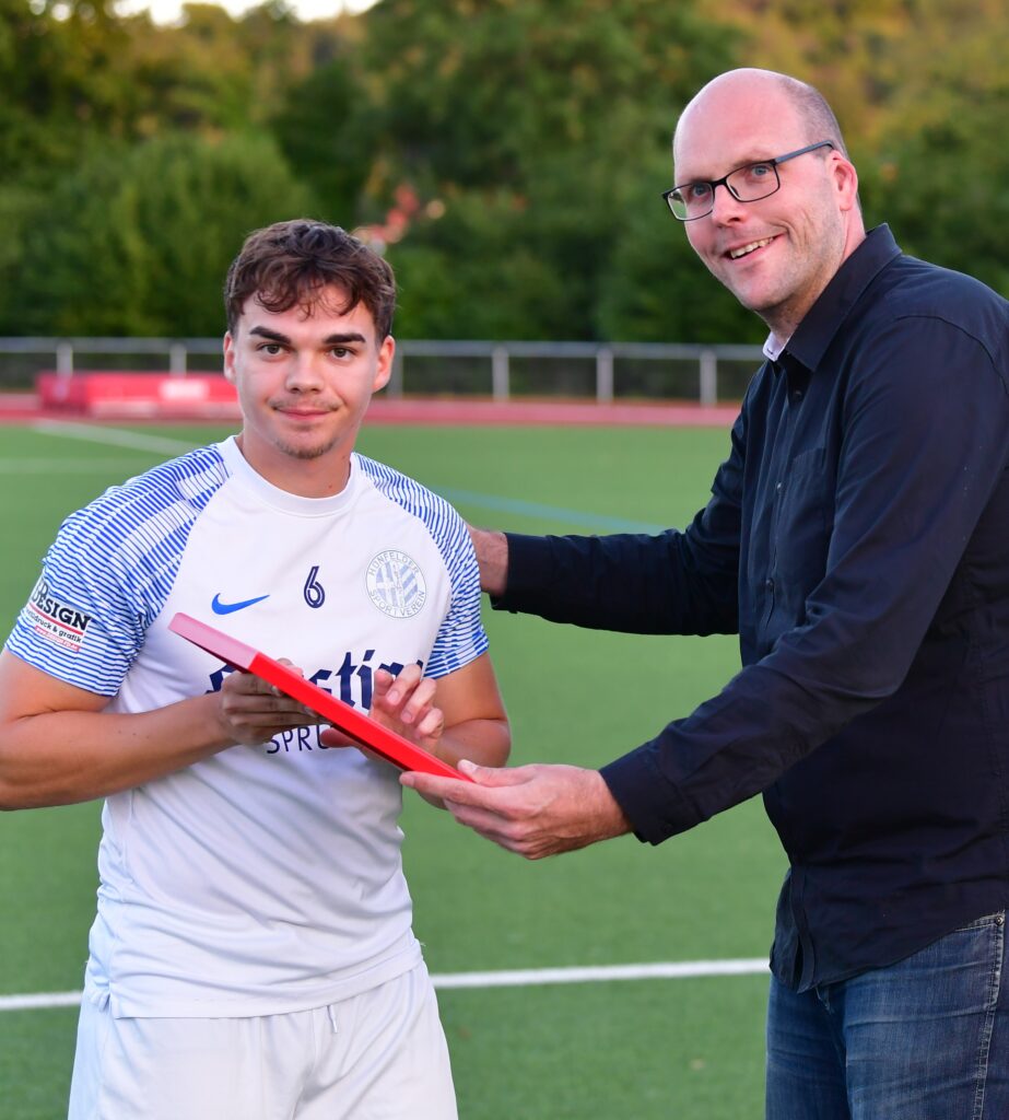 Vor der Partie gegen SV Adler Weidenhausen und dem fulminanten 6:0-Heimerfolg der Hünfelder über die Nordhessen wurde HSV-Spieler Leon Zöll vom stellv. Verbandsfußballwart Matthias Schmelz